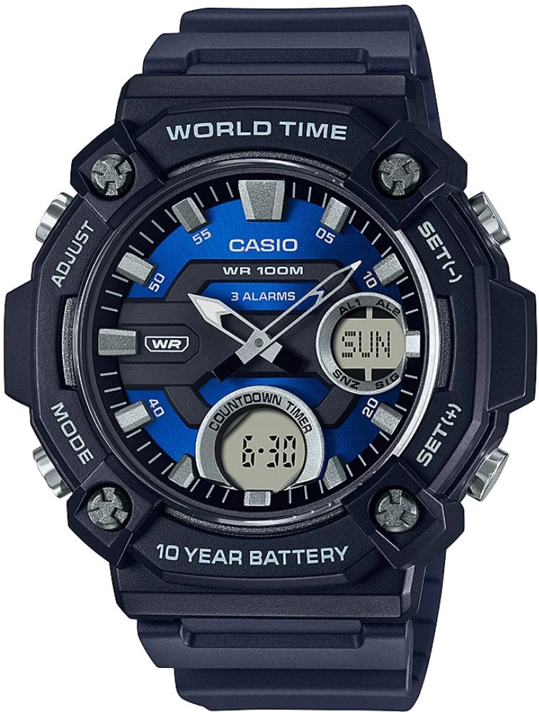 Casio AEQ-120W-2AVDF, güçlü ve fonksiyonel yapısıyla aktif yaşam tarzına sahip kullanıcılar için tasarlanmış modern bir analog-dijital saat modelidir. Geniş kasa yapısı, yükseltilmiş kadranı ve sportif tasarımı sayesinde hem dikkat çekici bir görünüm sunar hem de kolay okunabilirlik sağlar. Siyah kasa ve mavi detayların birleşimi, saate dinamik ve güçlü bir karakter kazandırırken, reçine kasa ve kayış yapısı uzun ömürlü ve dayanıklı kullanım sunar.