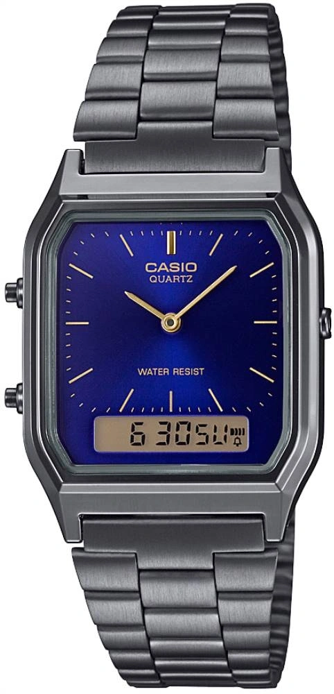Casio AQ-230GG-2ADF, markanın ikonik analog-dijital saat tasarımını modern renk ve materyallerle yeniden yorumladığı Vintage serisinin dikkat çeken modellerinden biridir. Köşeli kasa formu, koyu gri (ion kaplama) çelik kordonu ve mavi kadranı ile güçlü ve sofistike bir görünüm sunar. Analog akrep-yelkovan ile dijital ekranın birlikte kullanılması, hem klasik saat estetiğini hem de dijital fonksiyonların pratikliğini aynı anda sunar.