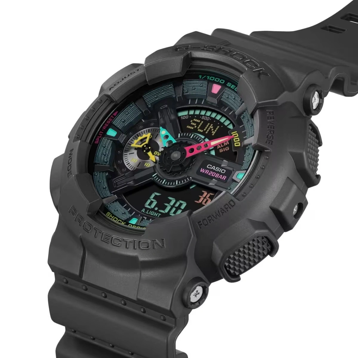 Casio GA-110MF-1ADR, G-SHOCK’un efsanevi büyük kasa tasarımını (GA-110 serisi) canlı ve çok renkli detaylarla buluşturan erkek kol saatidir. Siyah zemin üzerine yerleştirilen dinamik renk geçişleri, saate enerjik ve dikkat çekici bir karakter kazandırır.