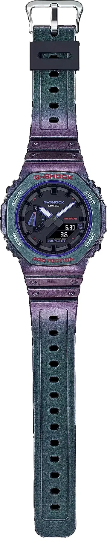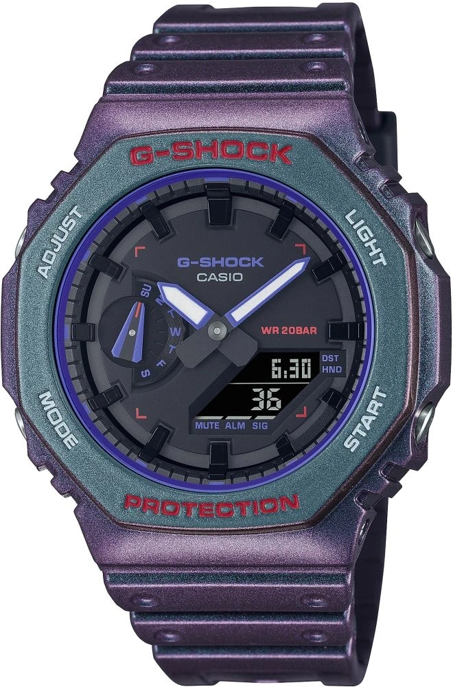 Casio GA-2100AH-6ADR, G-SHOCK’un ikonik sekizgen “CasiOak” tasarımını modern mor tonlarla buluşturan unisex kol saatidir. Alışılmış siyah ve gri tonların dışına çıkan bu model, stiline farklılık katmak isteyen kullanıcılar için özgün ve dikkat çekici bir alternatif sunar.