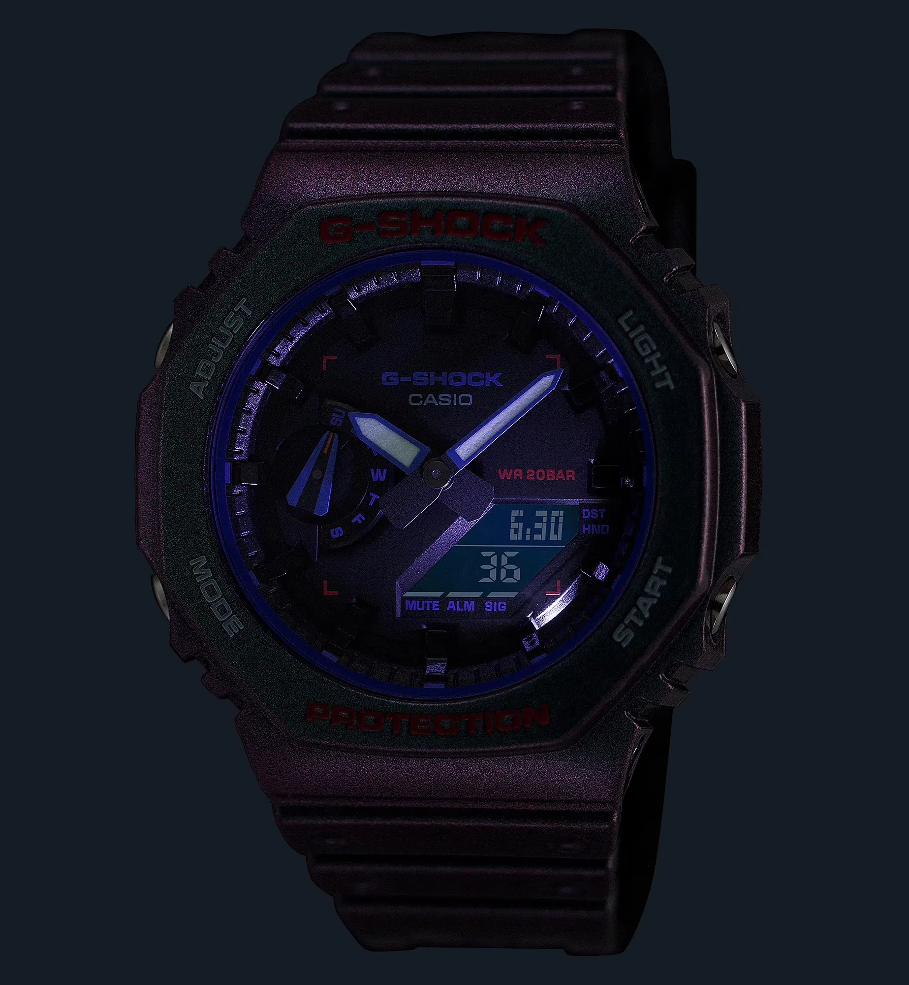 Modern mor tonlar, ikonik tasarım ve G-SHOCK dayanıklılığı.