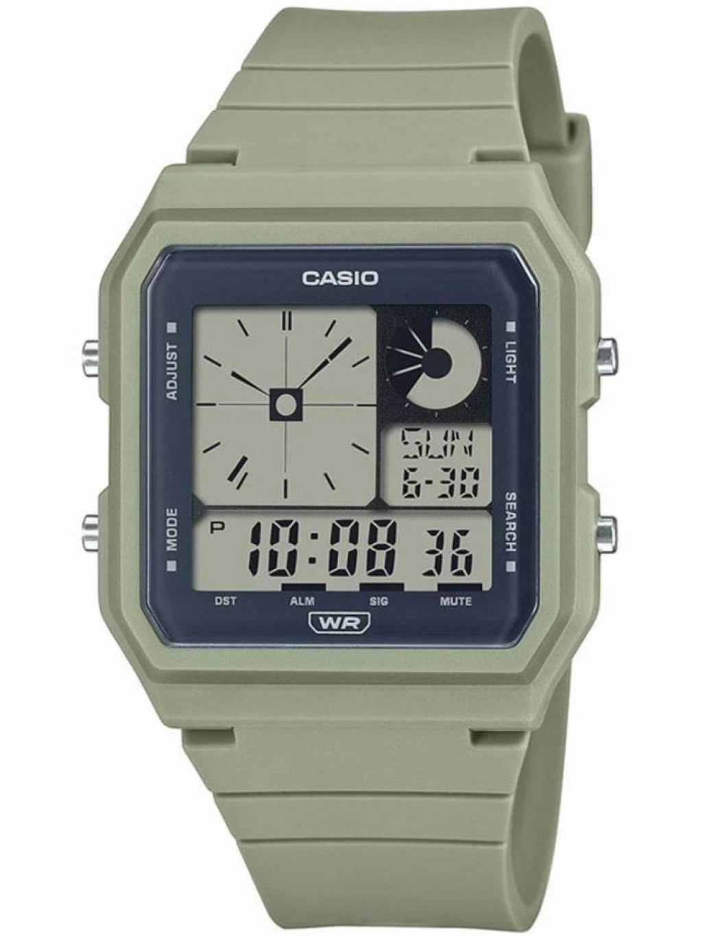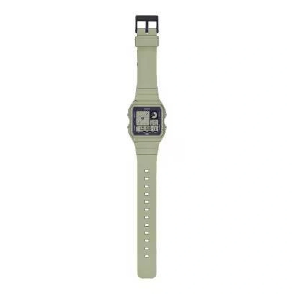 Casio LF-20W-3ADF, retro çizgileri modern bir formda sunan kompakt dijital bir saat. Yaklaşık 37,8 × 33,7 mm kasa ölçüsü ve yalnızca ~23 g ağırlığı ile bilekte neredeyse hissedilmez bir açık hava şıklığı sunar. Yeşil-tonlu reçine kasa ve kayışı, gün ışığında dikkat çekerken; bio-bazlı reçine kayış çevre bilincini de yansıtır. Dijital ekranı; zaman, tarih, kronometre ve alarm gibi fonksiyonları sade bir arayüzde sunarken, amber LED arka ışığıyla gece okumasını da kolaylaştırır. “Retro ruhuyla geleceğe bak” diyen kullanıcılar için, bu model hem günlük kullanımda hem şehir kullanımında şıklığı kolaylaştıran bir tercih.